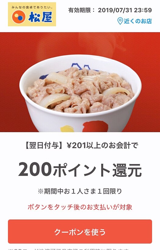 松屋の並盛り牛めしは320円(税込)のため、実質120円で食べられます。